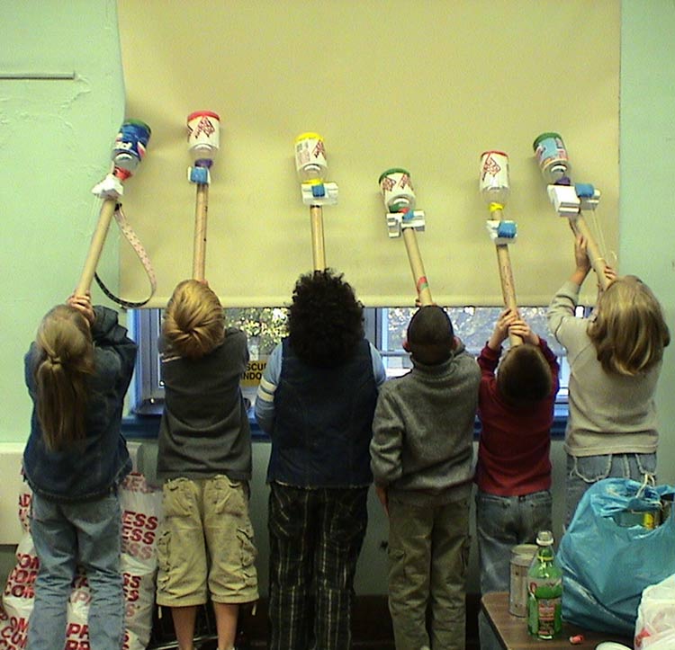 Students build an orchestra of homemade instruments including percussion, winds and strings, and learn playing techniques for each one. They learn the science of musical vibration, how to use math to compose music, how to read and write musical notes, how to count and play rhythms etc. Students then learn to compose, arrange and play music as an ensemble, creating individual and group scores and arrangements for the instruments. They also take turns conducting the group in improvisational music-making. This workshop culminates in a performance for the school, parents, family and the community. Afterwards students get to take all of their instruments home.